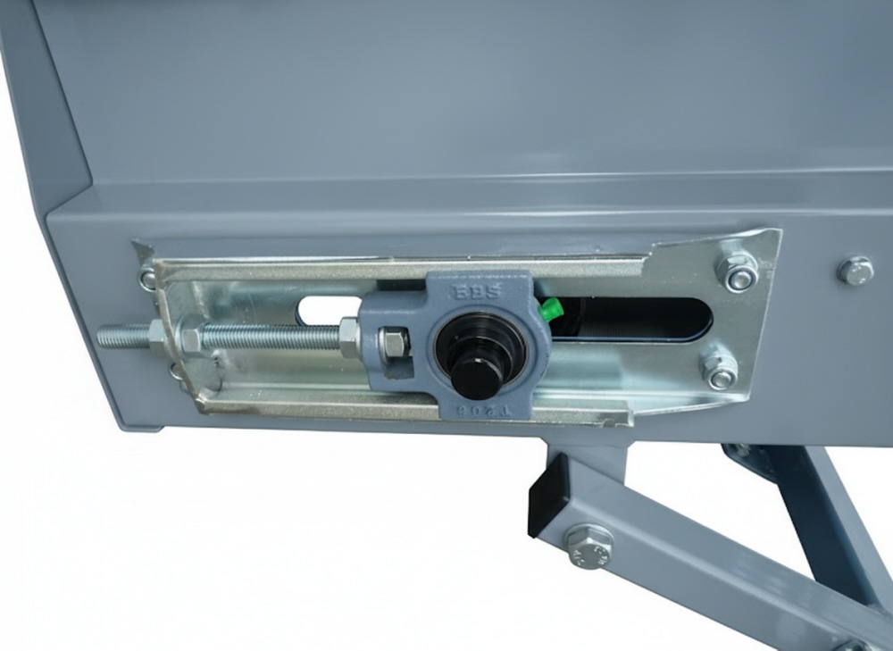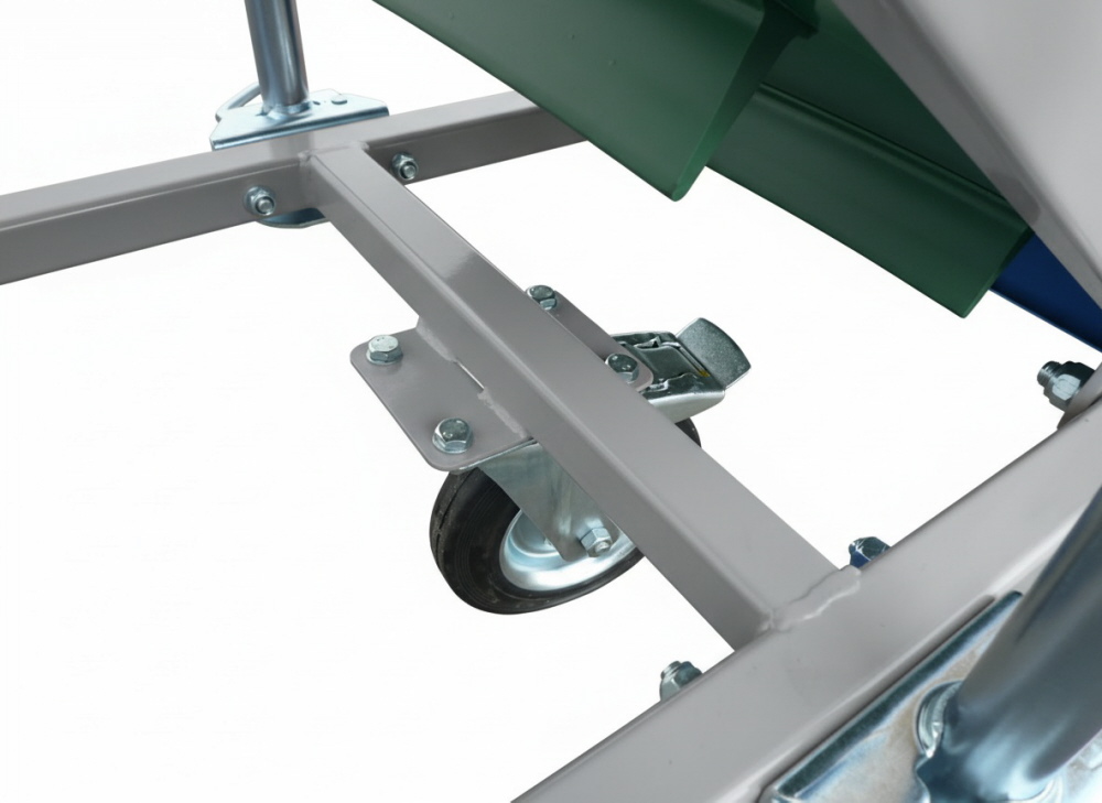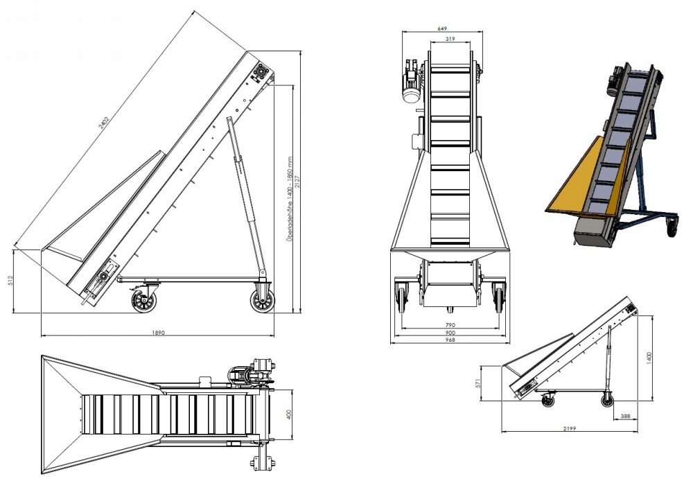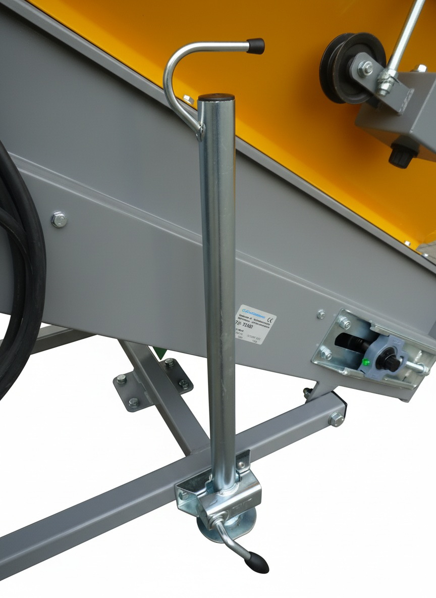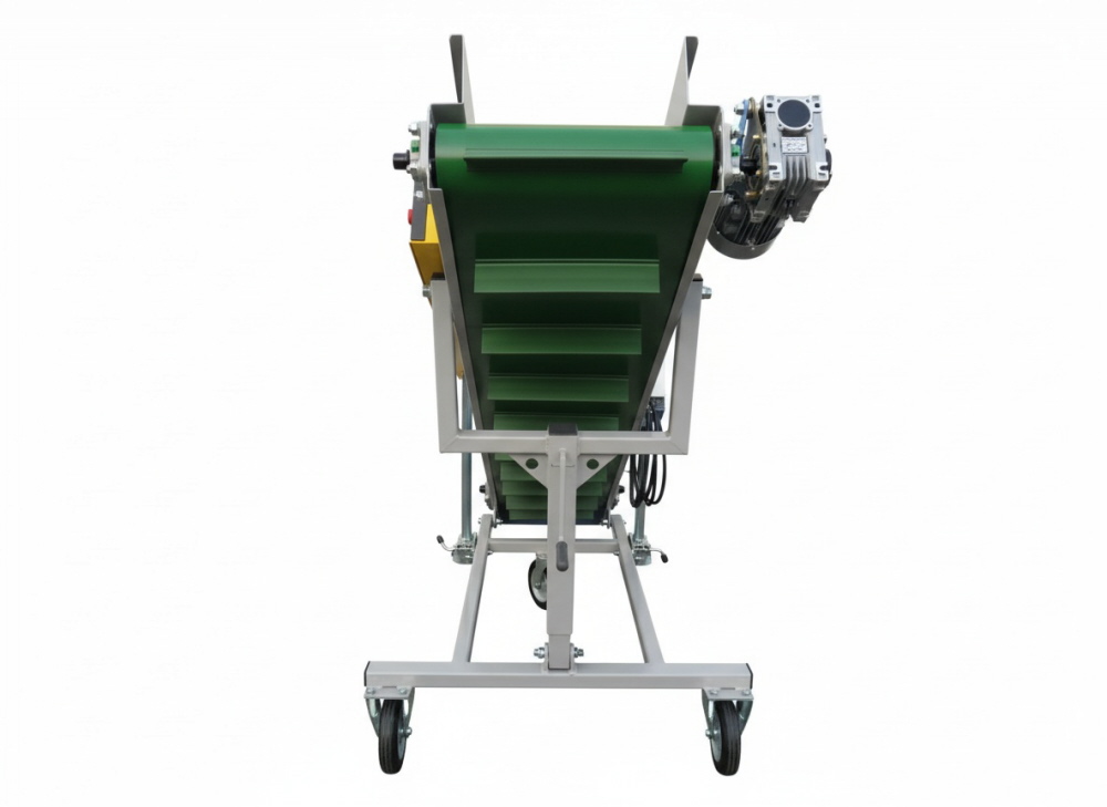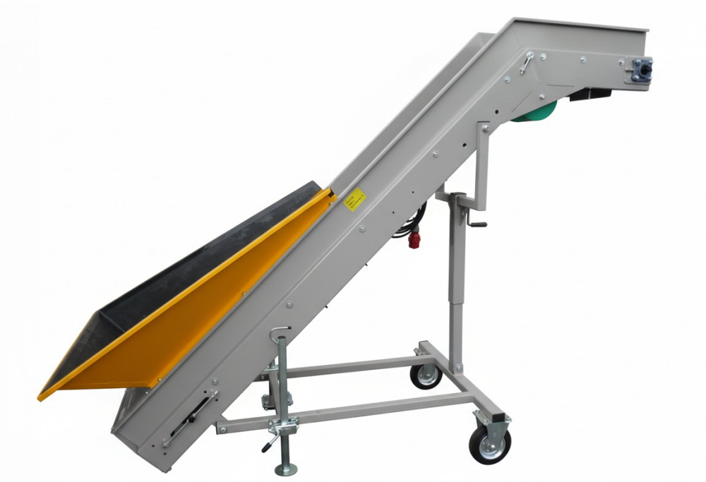 Damit Sie die Förderbänder bewegen können, verfügen diese über ein kleines Fahrwerk, welches teilweise über eine Seilwinde oder über eine Schiene in der Höhe verstellen lassen. Das Stollenband hat einen Trichter verbaut. Über einen Frequenzumrichter kann die Geschwindigkeit des Förderbandes angepasst bzw. reguliert werden.